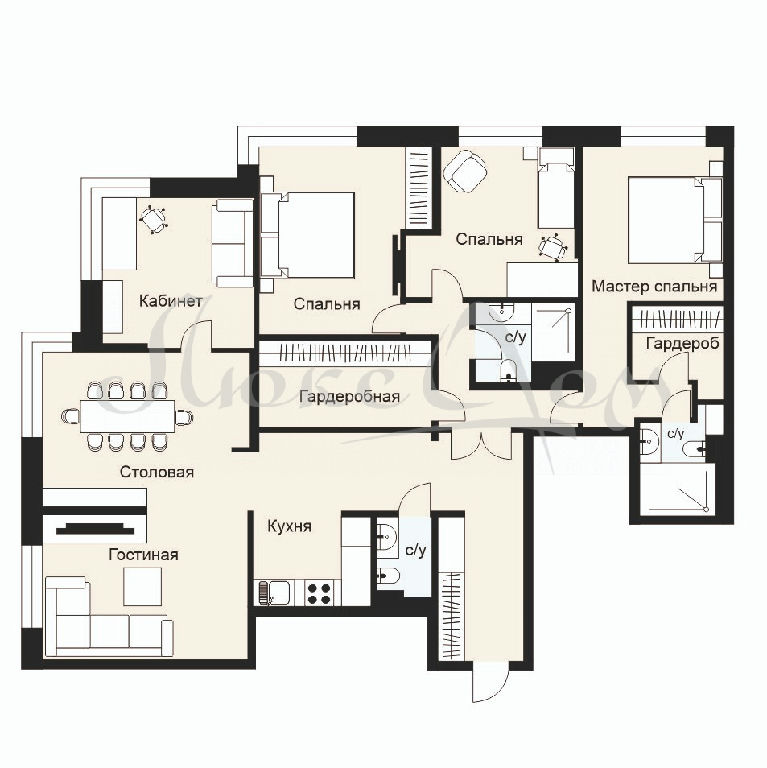 - предполагает до 5 изолированных комнат. Оптимальным вариантом станет: кухня-гостиная, 3-4 спальни и/или кабинет, постирочная, 3 с/у. Но вы можете спланировать пространство по своему вкусу.